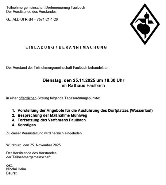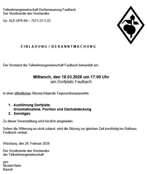 Ferner wird von der Gemeindeverwaltung ein Vertreter für die Gemeinde Faulbach ernannt.