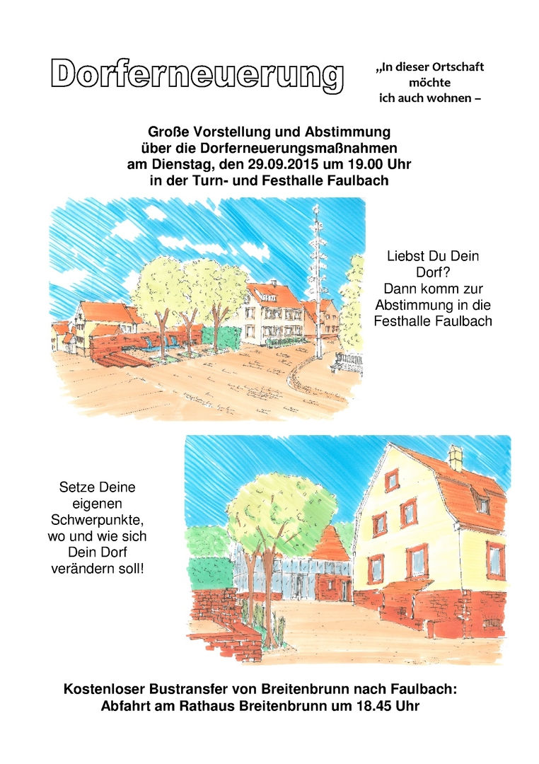 In Eußenheim realisiert die Gemeinde gerade in der Ortsmitte an der Stelle von zwei früheren Gehöften einen Dorfplatz und ein Parkdeck mit dem Spielplatz des Kindergartens darüber. In Urspringen wird eine Straße mitten durch einen Scheunenriegel gebaut und Karbach gilt heute als Musterdorf für Innenentwicklung. Vor 25 Jahren standen hier 26 Gebäude leer. Die Exkursion soll Chancen für unseren Ort aufzeigen, Mut machen und dabei helfen, Visionen und Lösungen für Faulbach und Breitenbrunn zu finden. Die Gemeinden waren alle im bayerischen Dorferneuerungsprogramm. Wir können hier sicher viel lernen, auch wenn nicht alles 1:1 auf unser Dorf umsetzbar ist. Die Veranstaltung endet mit einer gemeinsamen Brotzeit in Karbach.